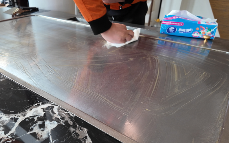 2、用铲子清除台面上的防锈保护油,用厨房用纸或毛巾将煎板擦拭干净(或直接用厨房用纸擦拭)
