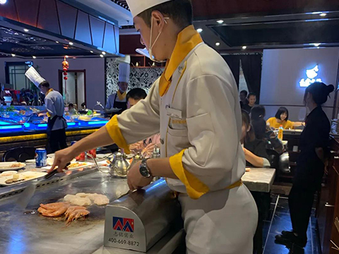 专业的铁板设施:每张桌子上都配备大大的铁板,厨具、调料一应俱全,为厨师现场烹饪提供便利,也让顾客能够近距离欣赏厨师的花式表演。