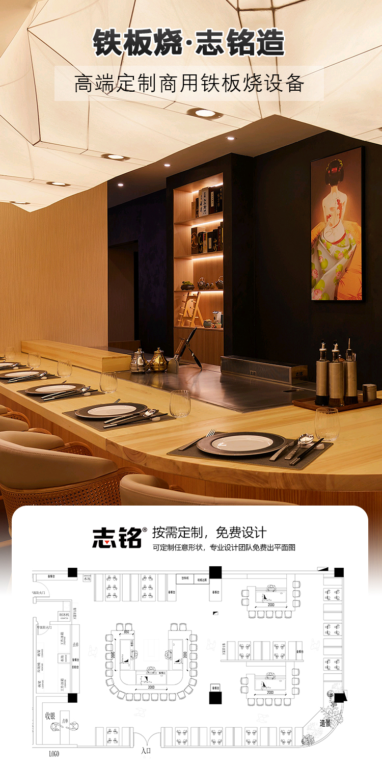 铁板烧·志铭造-家用铁板烧设备定制-岛台式、台面式、嵌入餐桌或整体橱柜等多种样式可选,免费设计